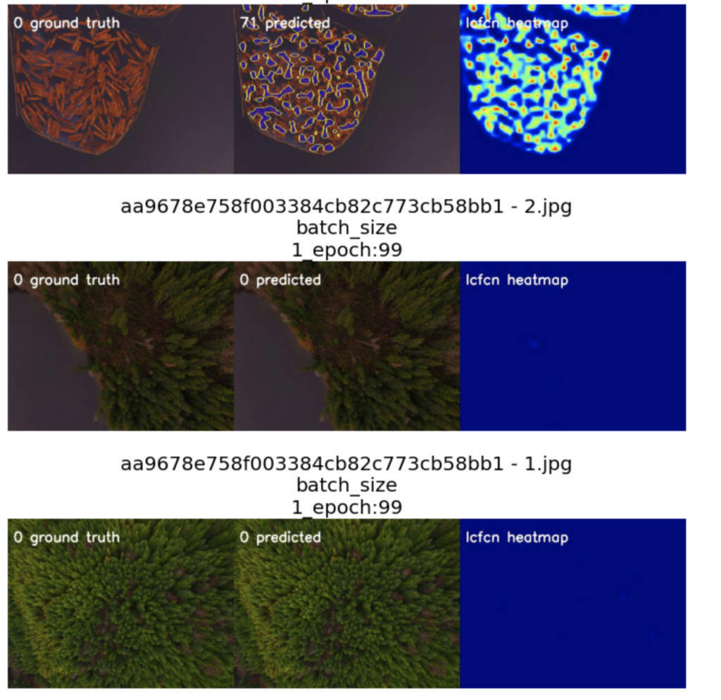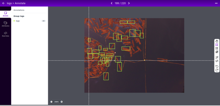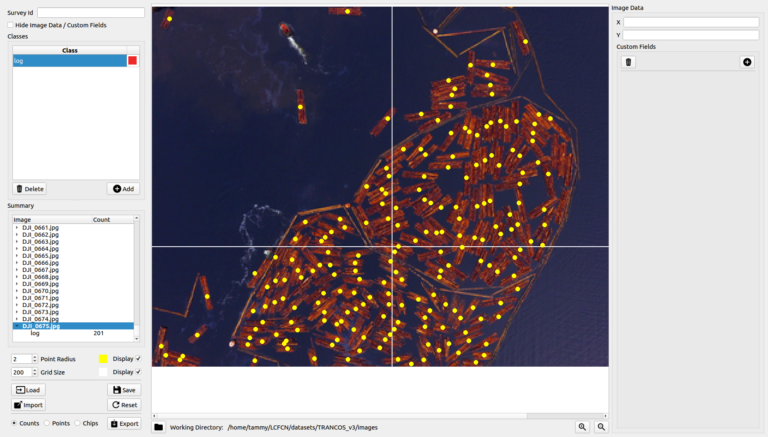 It is a lot easier to complete annotating the logs with a point-based annotation format. The point annotation is created at the center of each log bundle, to mark it as an object to be counted. The open-source tool used here is called ‘DotdotGoose’, which is easy and intuitive to use to create point annotations. This format would be much easier to scale when creating a larger number of manual annotations for the object to be counted.