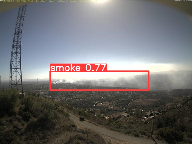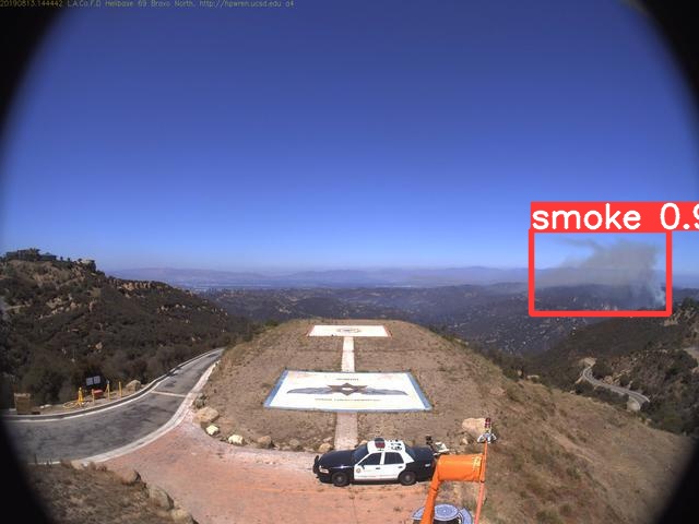 Similar to detection of maritime objects, we are also able to detect the presence of smoke in an aeria image. This application could be critical to alerting wildfires or other causes of large fires in remote areas with limited manual monitoring. It would be relatively easy to deploy this smoke detection model on an edge platform deployed at a remote observation site, to constantly monitor any fire and smoke appearances, and can be critical to active wildfire prevention through real-time alert generation.