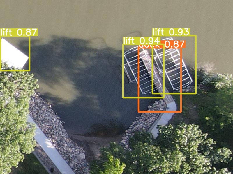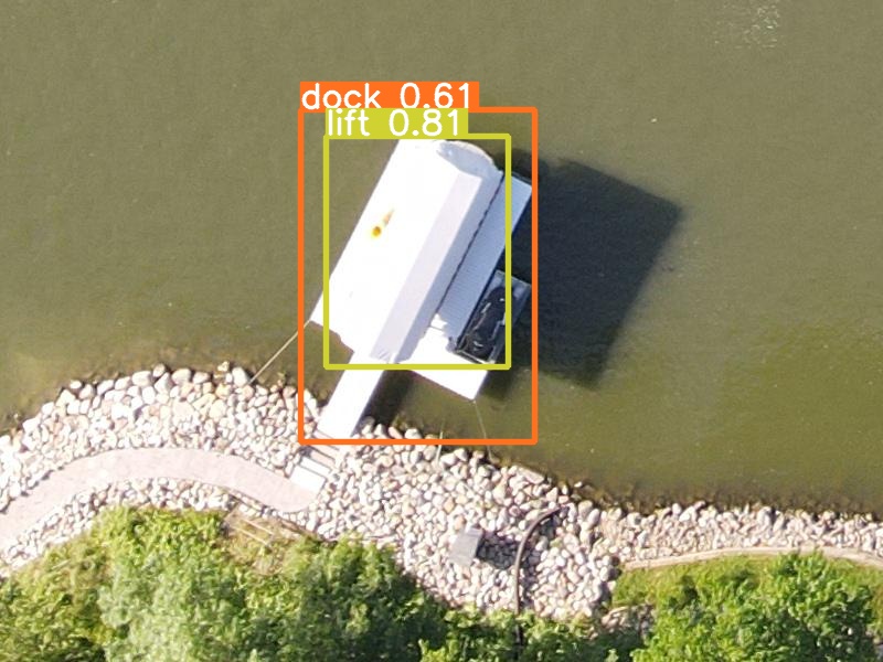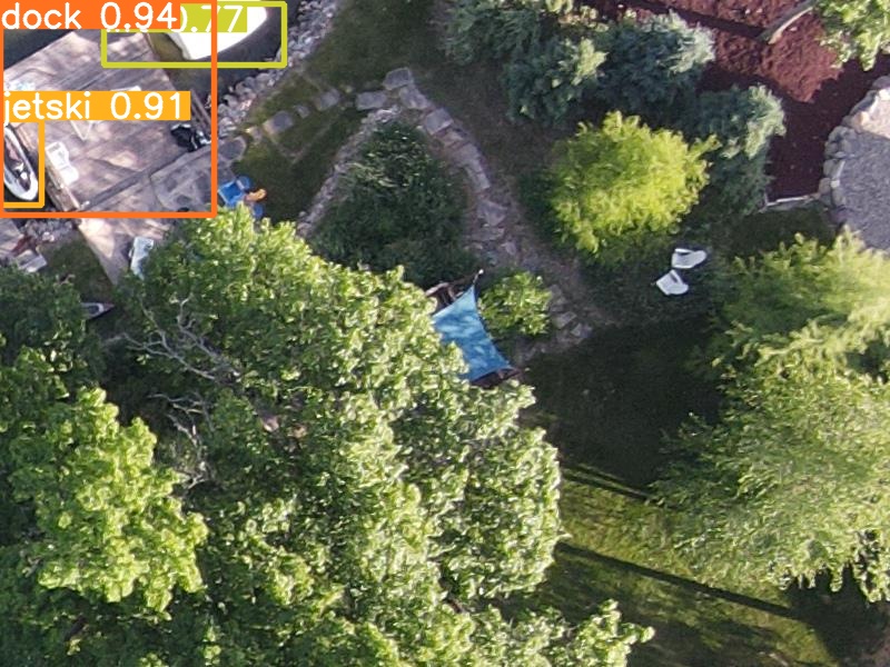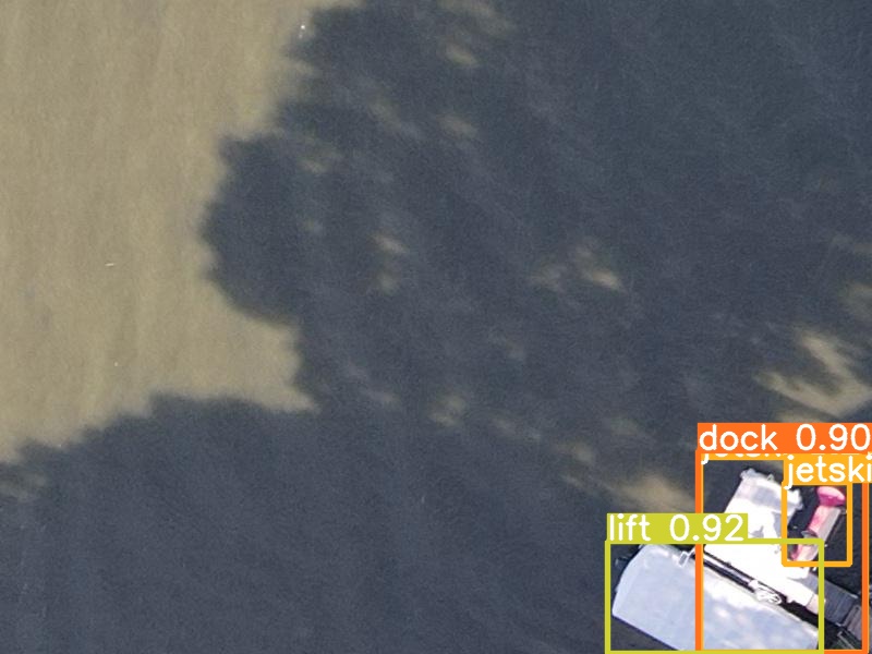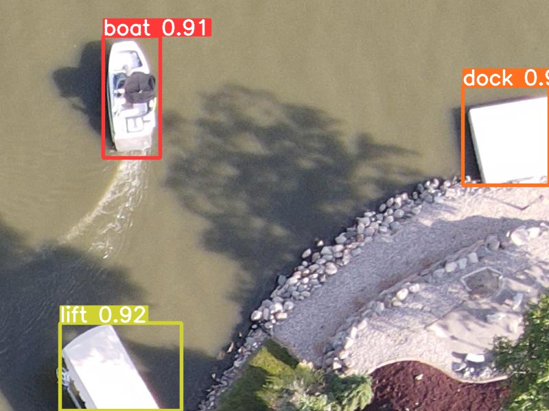 The Aerial Maritime Dataset is an open-source dataset released on the Roboflow platform. The dataset, collected by a drone flown at 400ft, contains 74 images of aerial maritime photographs taken with via a Mavic Air 2 drone and 1,151 bounding boxes, consisting of docks, boats, lifts, jetskis, and cars. Some of the results (below) show near-perfect detection of the 5 categories of objects with a trained Yolov5 model.